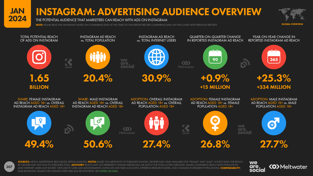 The global advertising audience of Instagram in January 2024 reached approximately 1.65 billion adults with equal distribution between genders while showing steady annual growth. Since its launch in 2010 Instagram has kept its position as one of the biggest social networks while supporting an enormous user base. The owner company Meta does not release official user statistics but multiple reliable sources confirm Instagram achieved more than 2 billion monthly active users during the recent period.