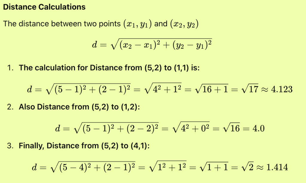 Data: X (1, 1), X (1, 2), O (4, 1) || Point: (5, 2), Does the new point belong to X or O?